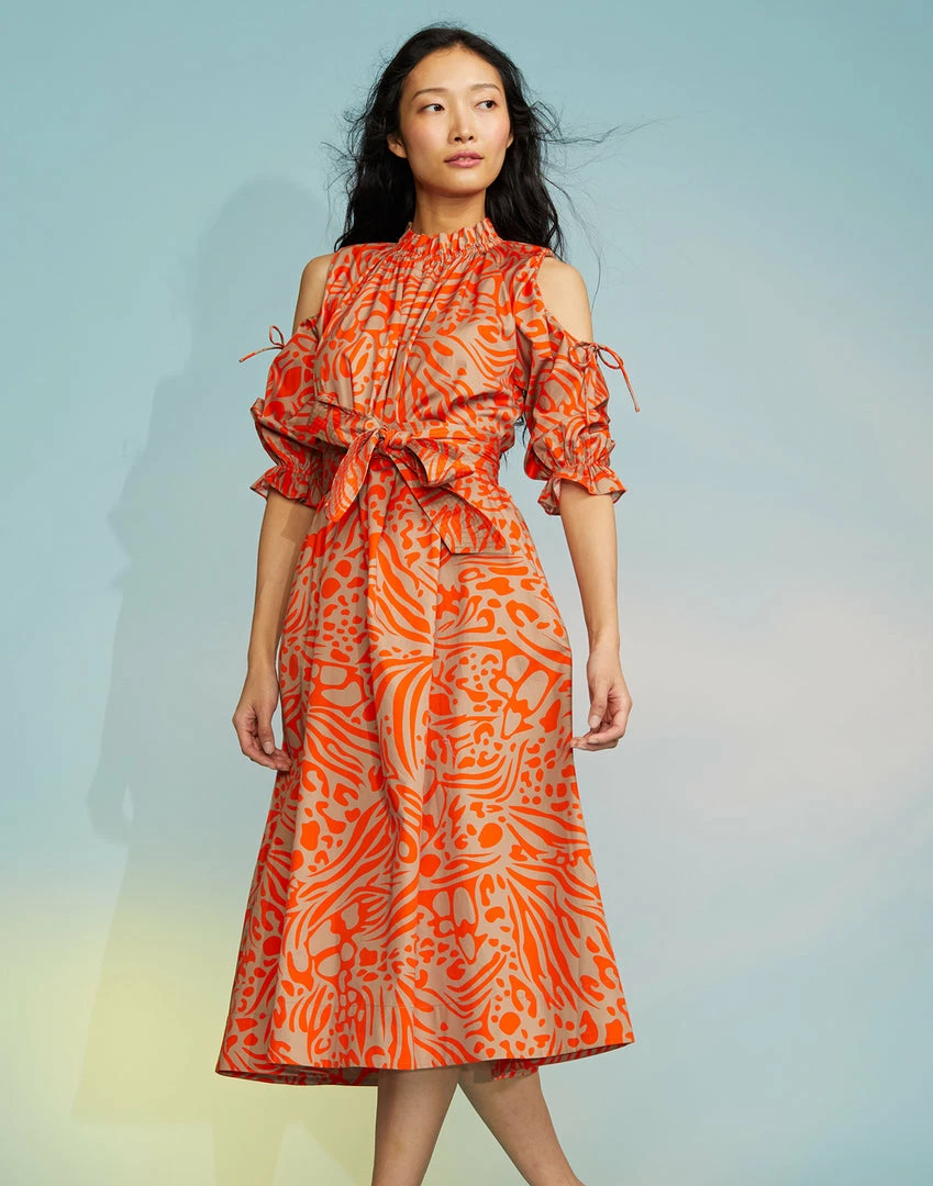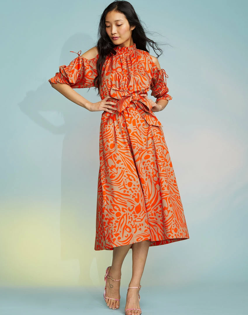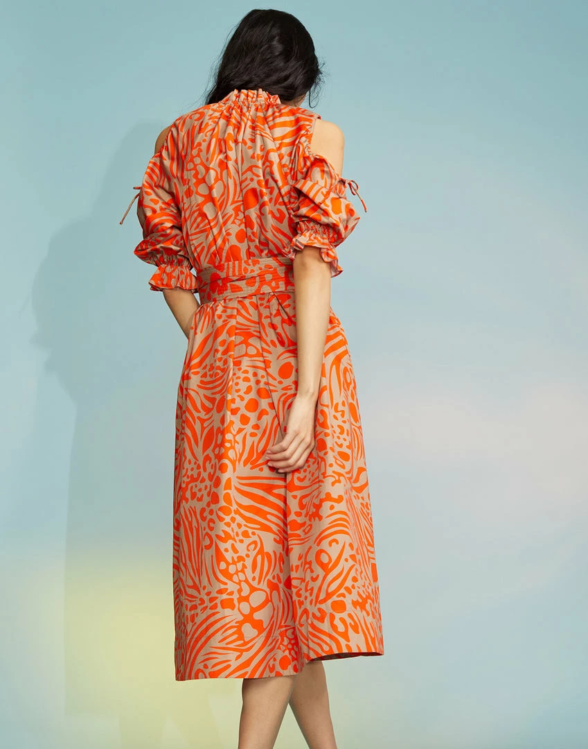 Abstract print midi dress with cut out shoulder detail.