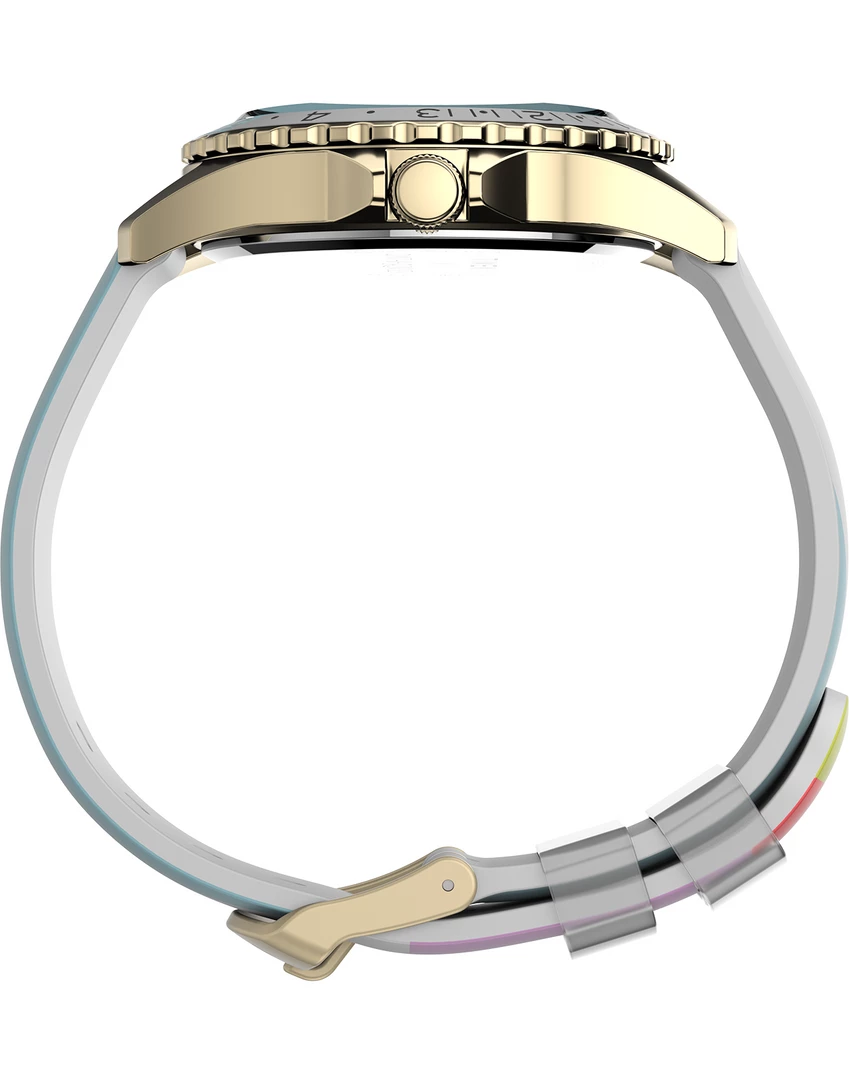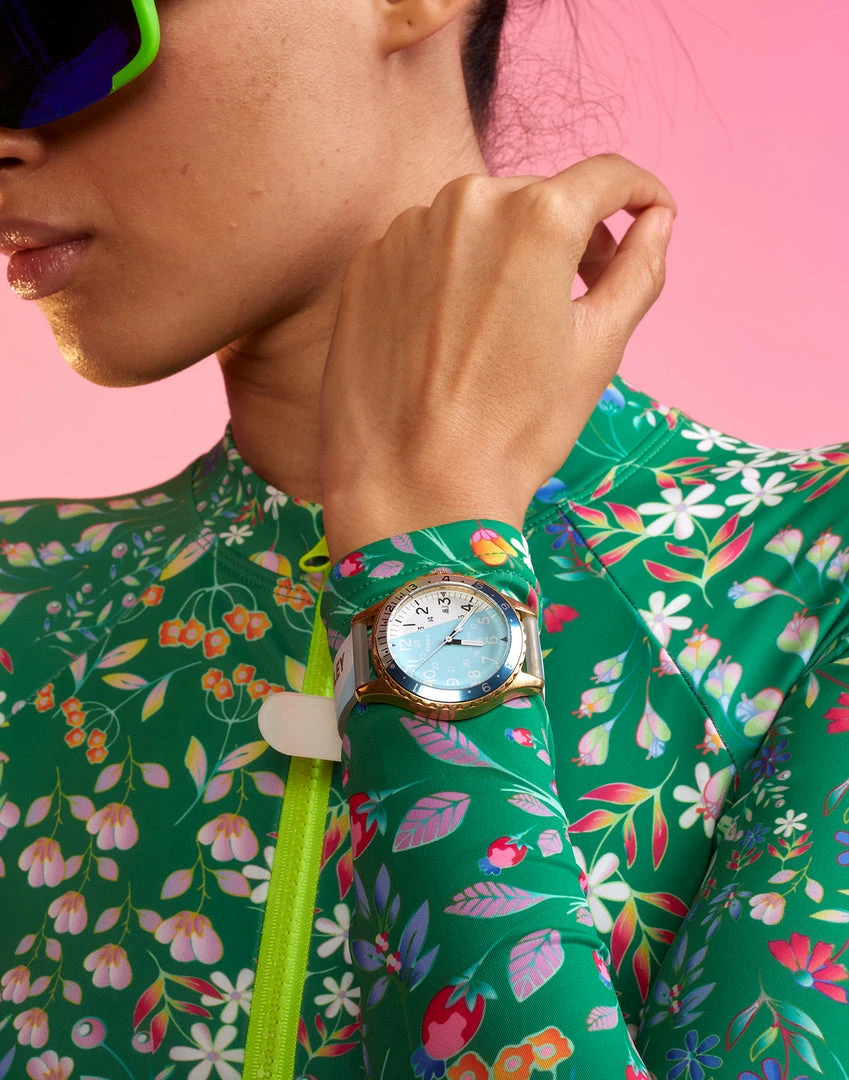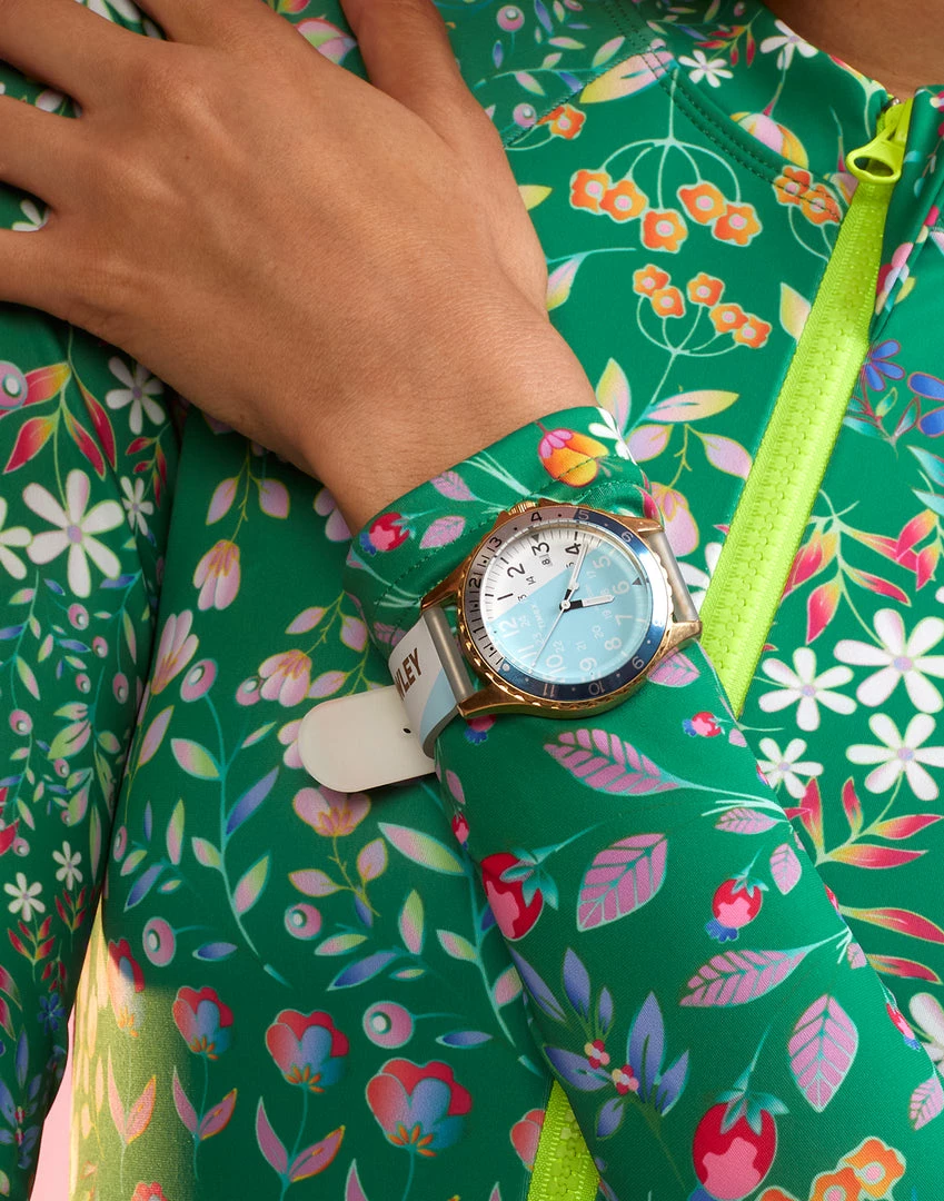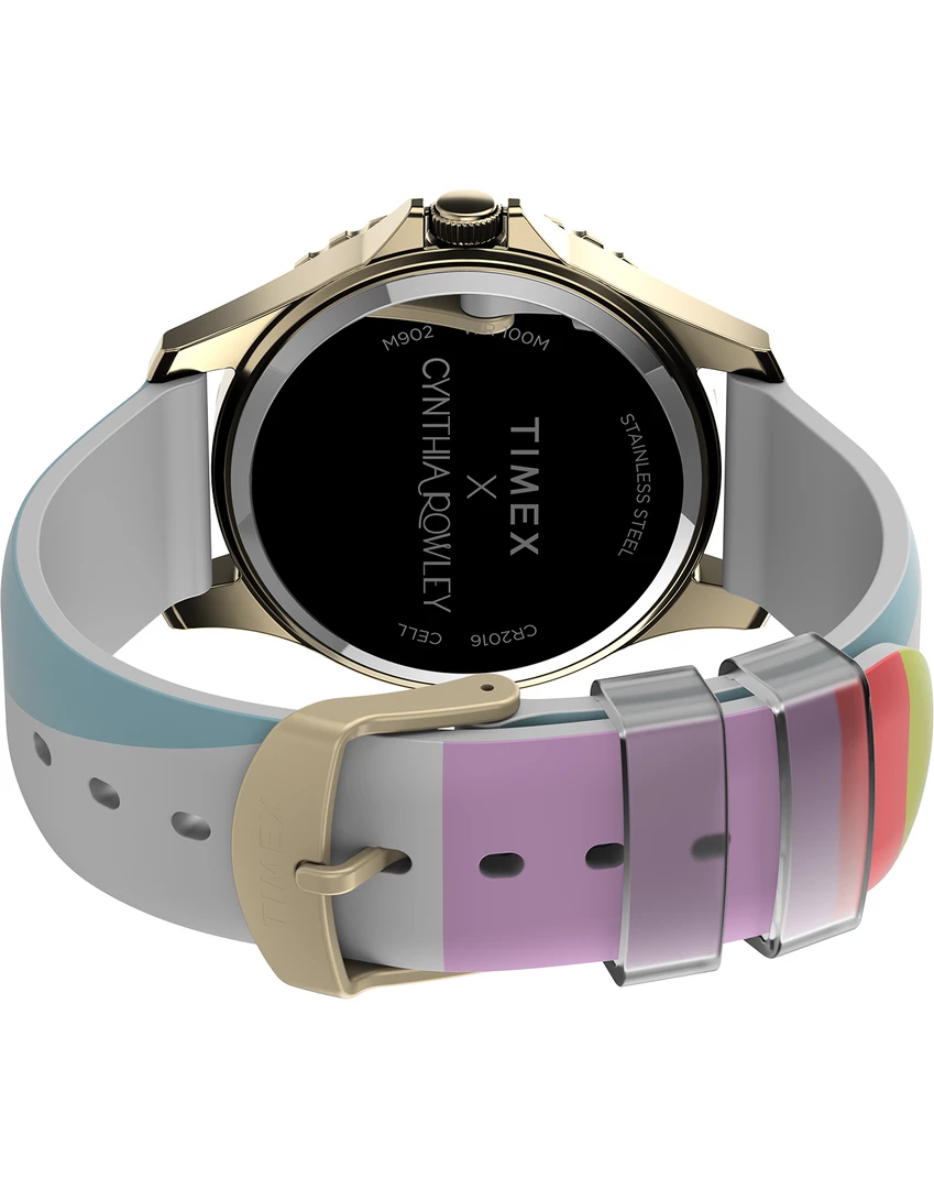 Fashion should be an adventure. This is the philosophy of the iconic Cynthia Rowley, the Manhattan-based designer behind the eponymous global lifestyle brand. Designed for life on sand and sea, the Timex® x Cynthia Rowley® Navi evokes our shared spirit of fashionable practicality. Featuring the 38mm stainless-steel case profile of one of our best-selling, dive-style watches, this timepiece is directly inspired by the fashion brand’s boundary-pushing neoprene wetsuit. Bold colors and eccentric patterns are mainstays of Cynthia Rowley’s pretty-meets-sporty assortment, and this watch delivers on both. A soft, beautifully crafted silicone rubber strap features Cynthia’s unmistakable color block design, while a mineral glass crystal lens protects the date window and luminant handset on the light blue and white dial. Equipped with a 100-meter water resistant rating and packed inside a custom neoprene pouch, it’s the free-spirited companion you can rely on in and out of the surf.