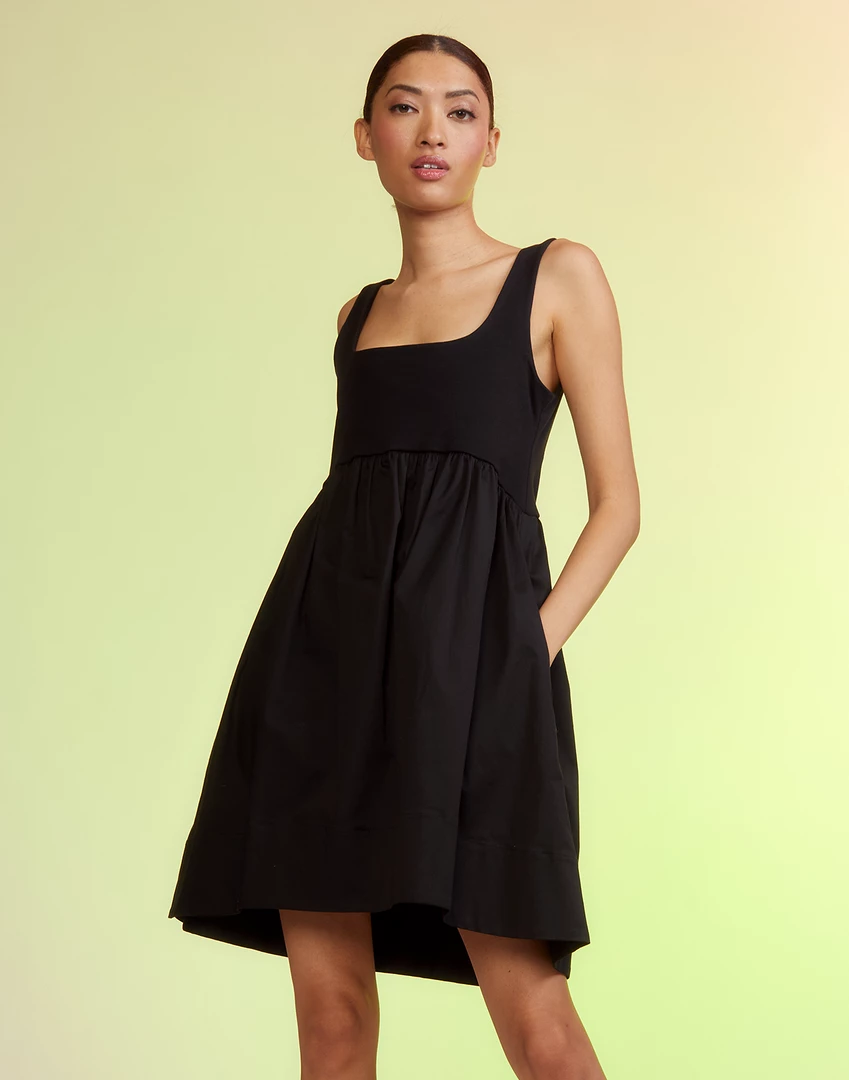 Soft jersey tank with cotton sateen skirt.