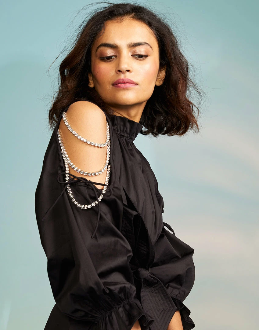 Black cotton midi dress with rhinestone shoulder detail.