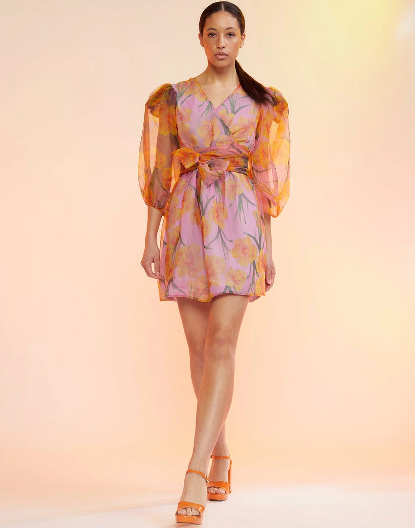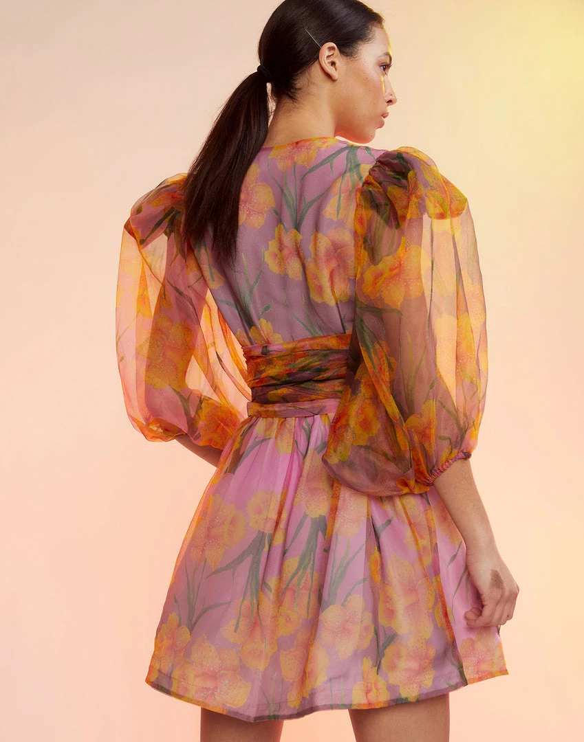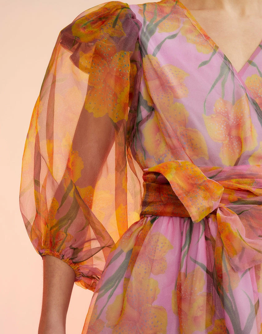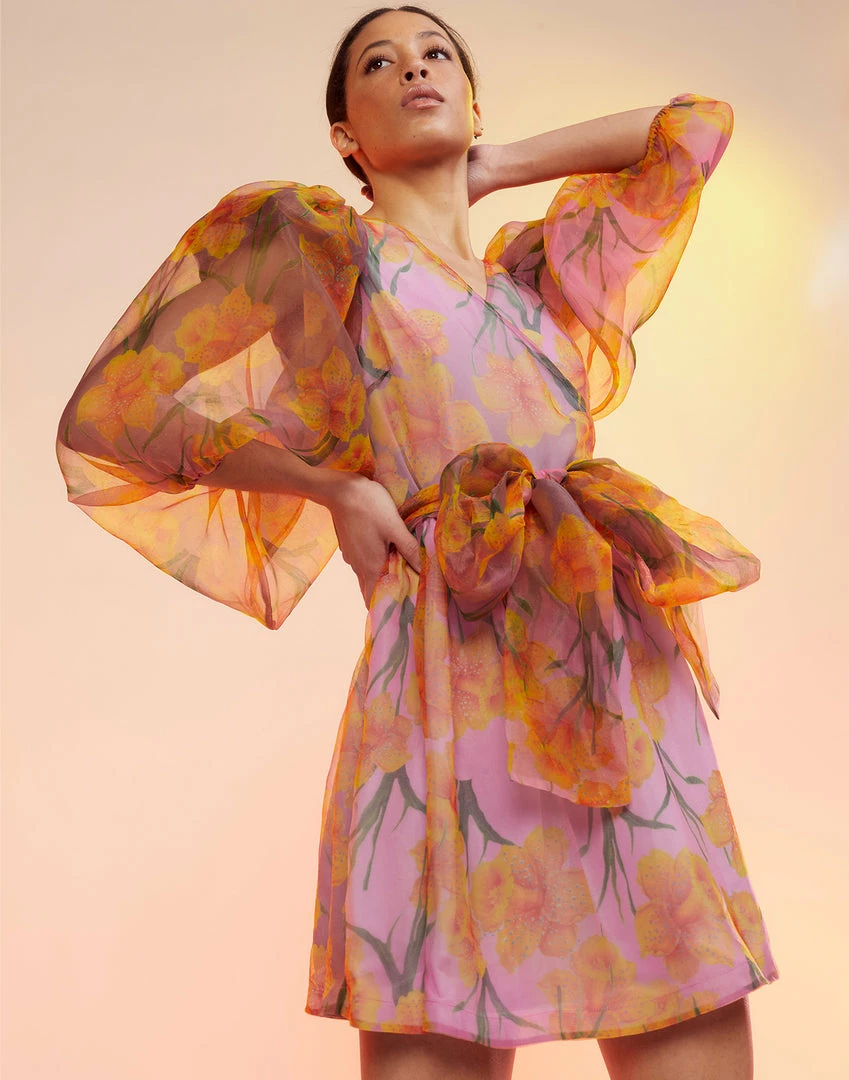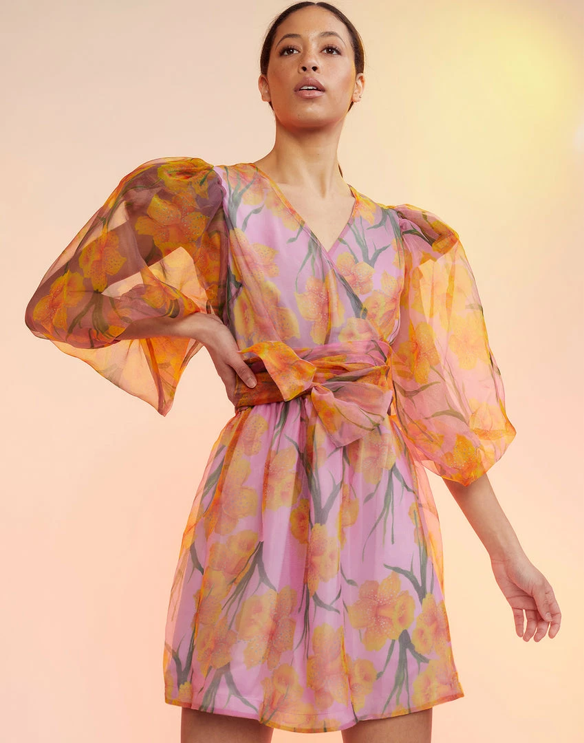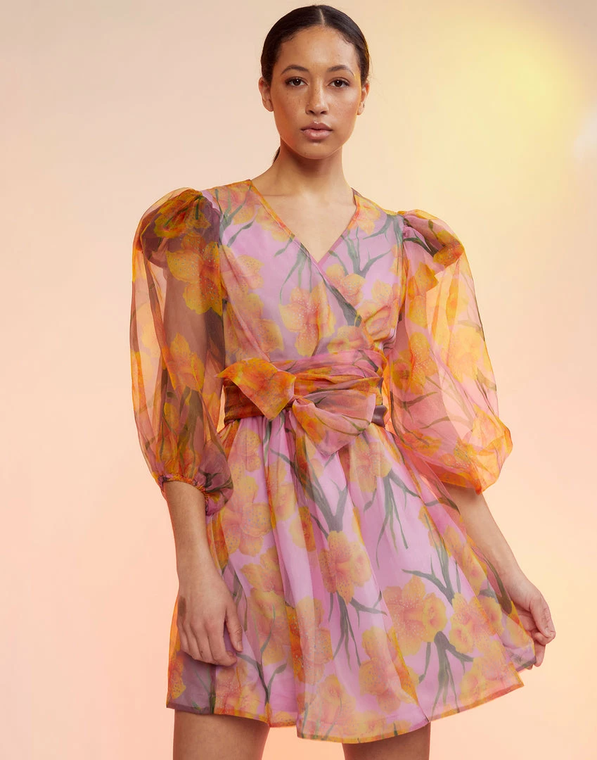 Daffodil printed organza wrap dress.