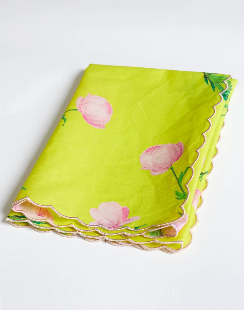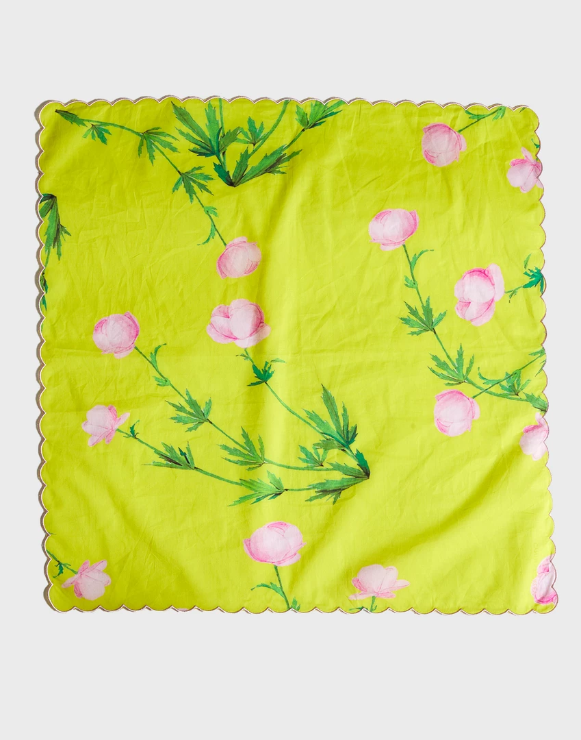 Printed cotton dinner napkins with scallop embroidered edge.Â