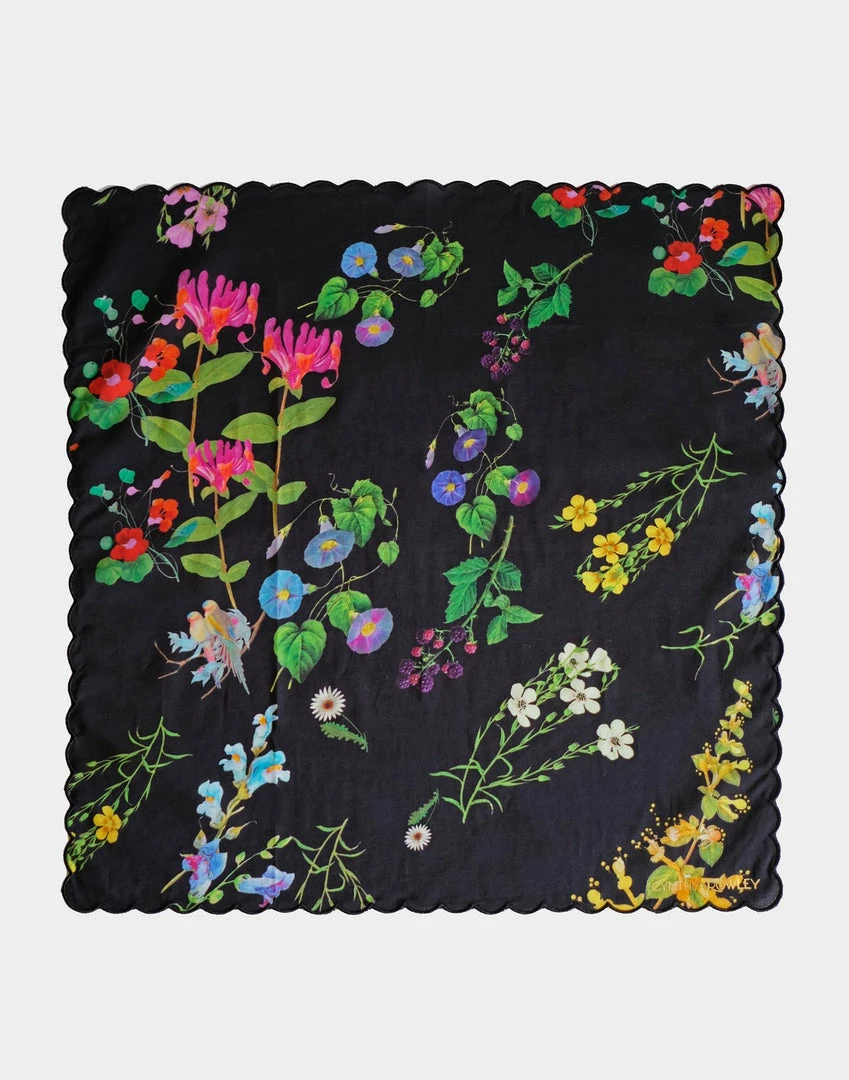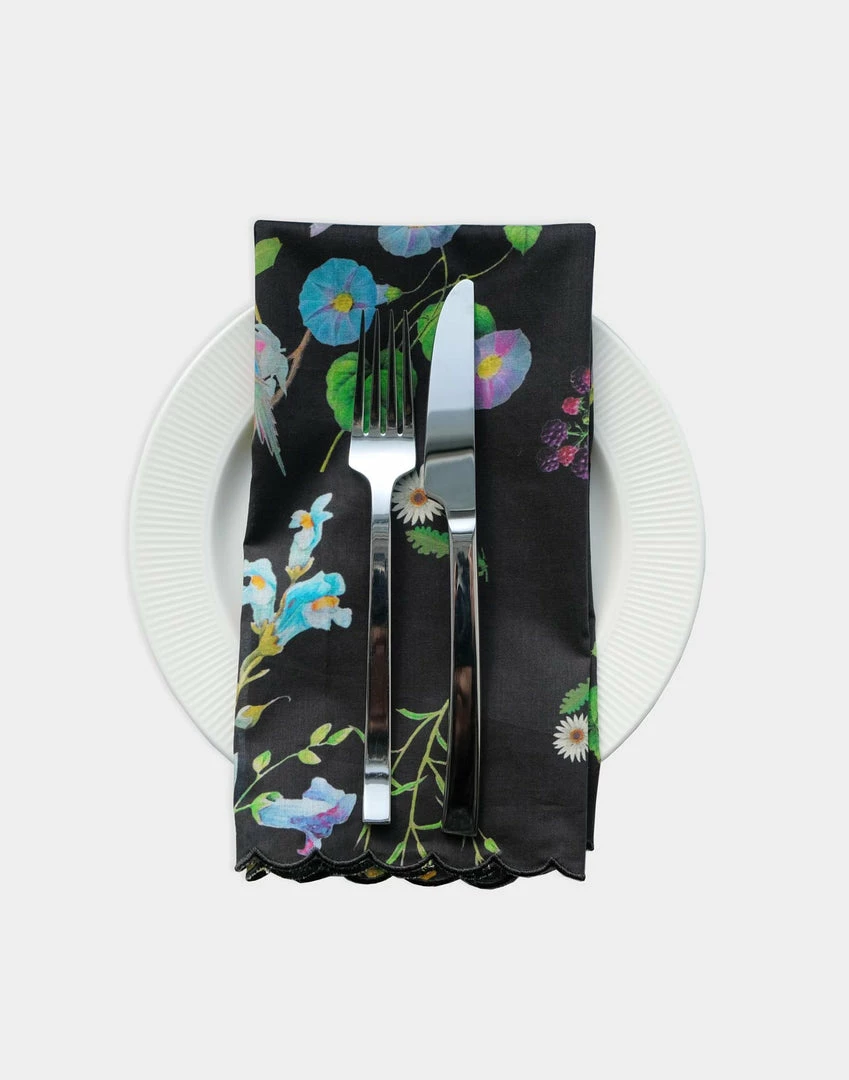 Printed cotton dinner napkins with scallop embroidered edge.Â