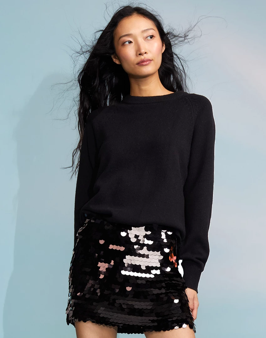 Black sequin mini skirt.
